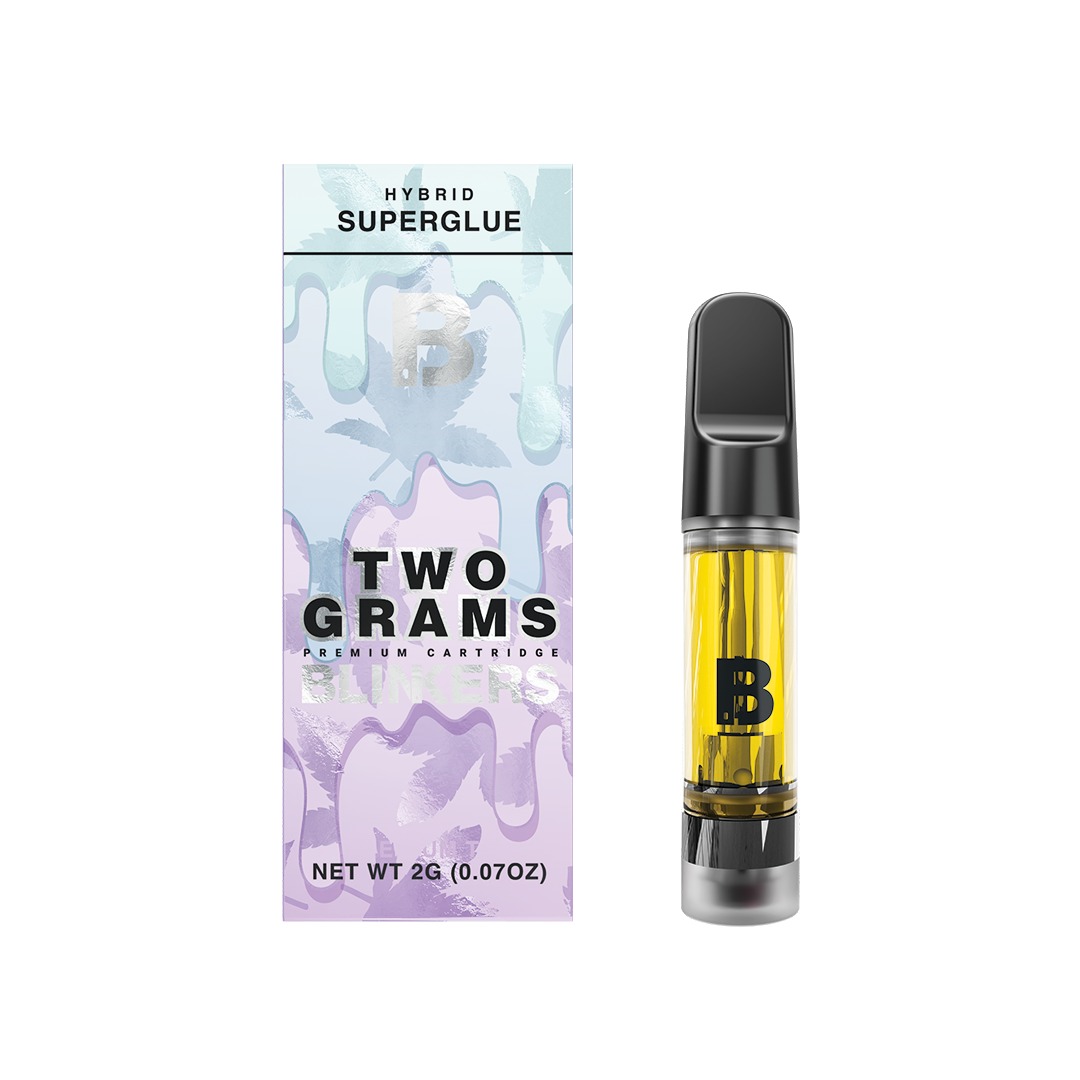 Super sticky, super dope, super packed. Superglue is a Hybrid strain made for kickin’ it with the homies. Filled with 2G of pure Cat3 Oil, and made for those who love the natural taste of kush, Superglue Blinker Cart tastes gassy and piney – simply fire!